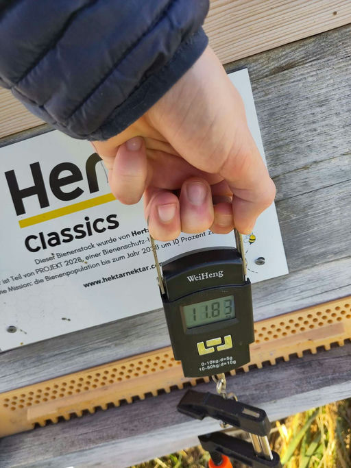 Es wurde auch der Futtervorrat kontrolliert. Wie erwartet haben die Bienen erst ca. 5 kg verbraucht, daher hat jedes Volk noch ausreichend Futter. Weiter habe ich noch die Volksstärke geschätzt. Leider waren H3 (Hertz Classics) und H4 (Hertz Ride) zu schwach und wurden daher vereinigt. Das Vereinigen ist notwendig, da zu schwache Völker im Frühjahr, wenn sie beginnen zu brüten, bei einem anschließenden Kälteeinbruch die Brut nicht ausreichend warm halten können – dies führt zum Absterben der Brut. Weiter muss dann natürlich auch jede Biene mehr Zucker in Wärme umsetzen, wodurch sie aus Erschöpfung früher sterben.