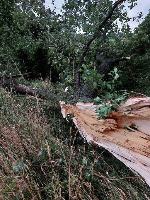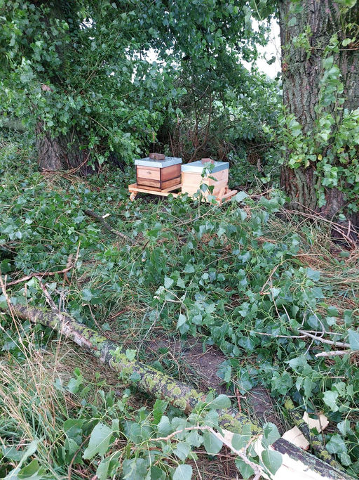 Der Juli 2022 begann ziemlich heftig. Bei einem Unwetter wurde Krefeld stark getroffen. Am 01.07. zog eine schwere Gewitterfront über Krefeld. Vielerorts wurden Bäume entwurzelt und Äste abgebrochen. Nachdem sich die Wetterlage wieder beruhigt hatte, habe ich mich auf den Weg gemacht, um alle Bienenstände zu kontrollieren. Insgesamt bin ich noch glimpflich davongekommen. Nur bei einem Stand wurden die Beuten von Ästen getroffen. Schnell konnte alles wieder aufgeräumt werden, und die Bienen sind mit einem Schrecken davongekommen.
