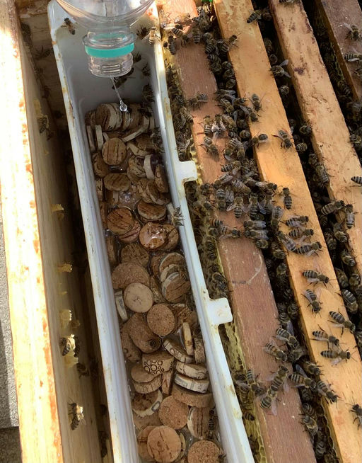 Bei meinem „Wein-Volk“, wie ich es nenne, ist alles in bester Ordnung. Die Varroabehandlung ist abgeschlossen und hat sehr gut angeschlagen. Die Wabenhygiene ist fast abgeschlossen, somit starte ich mit der Auffütterung des Weinvolkes. Das Volk wird jetzt langsam in mehreren Futterstößen, die bis in den Oktober dauern, gefüttert. Ich arbeite mit sogenannten Futtertaschen, in denen zerschnittene Weinkorken als Schwimmhilfe treiben, damit die Bienen bei der Aufnahme des Futters nicht ertrinken. Ich gebe den Bienen ca. 15 kg Futter für den Winter. So kann der Winter kommen und die Bienen starten gut in das neue Jahr.