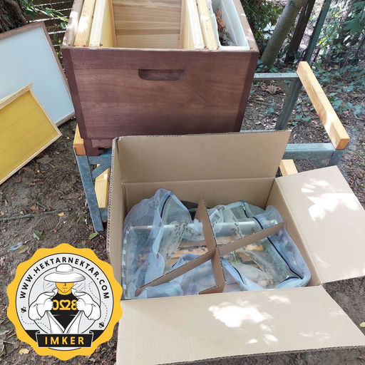 Die TELUS-Bienen sind da! Herzlich willkommen in eurem neuen Zuhause, ihr Summchen. Wie im Vorfeld abgesprochen, wurden die Bienen pünktlich mit einer Spedition, die auf den Versand von lebenden Tieren spezialisiert ist, zu mir geliefert. Dies geschieht in einer Bienen-Transportbox mit Belüftungsgittern und einem innenliegenden Netz, damit die Bienen genug Sauerstoff bekommen und die Wärme abgeführt werden kann. Zuerst wurden die Rähmchen in die TELUS-Beute gehängt und dann die restlichen Bienen aus der Transportkiste umgesiedelt. Zuallerletzt wurde das TELUS-Volk noch gefüttert. Dafür verwende ich einen Zuckersirup, einen sogenannten Invertzucker, der von den Bienen leichter zu verdauen ist. Insgesamt bekommen die Bienen über die nächsten Wochen verteilt je nach Volkstärke 15-20 kg Futter, um problemlos zu überwintern.