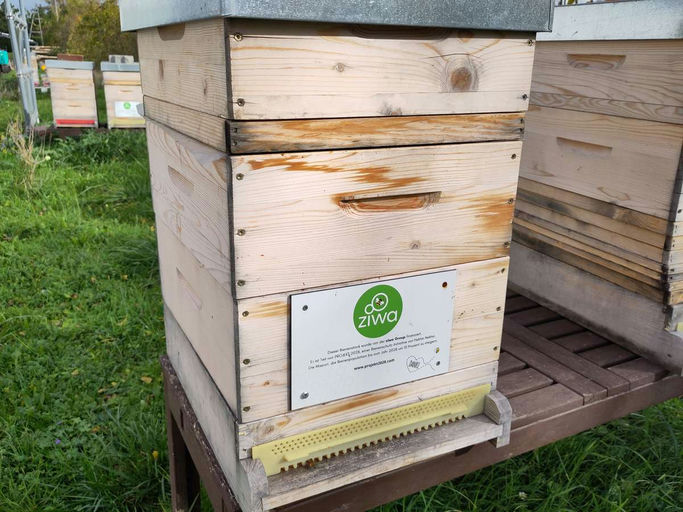 Jetzt ist genug Zeit, um sich mit dem Abfüllen und Etikettieren des Honigs zu beschäftigen, da bei den Bienen selbst lediglich kleine Kontrollen von unten gemacht werden. Man kann im Boden sofort feststellen, wie dicht die Bienen aneinander sitzen. Mit Hektarnektar ist die Ziwa Group definitiv ein ökologischer Vorreiter, was Honig für diverse "Give-aways" betrifft – denn noch regionaler als am eigenen Firmengelände produziert geht eigentlich nicht! Durch die regionale Produktion wird sowohl CO2 gespart, da der Honig nicht quer durch die Welt transportiert werden muss, als auch die Bestäubung der Region gefördert. Diese Bestäubungsleistungen machen übrigens zwei Drittel der Wertschöpfung der Bienenstöcke aus! Es ist doch erstaunlich, dass Bienenstöcke die einzigen Nutztiere sind, bei denen das Produkt eher ein "Nebenprodukt" ist.
