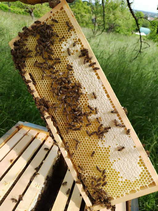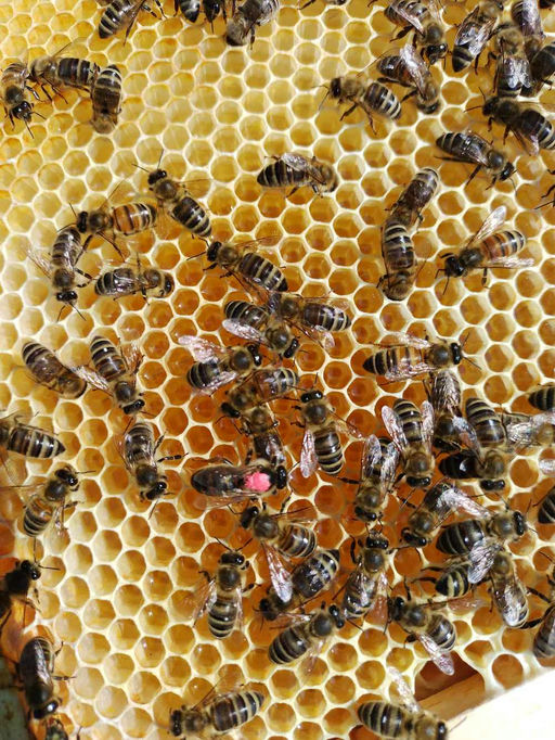 Im Monat Mai beginnt die stressige Zeit für den Imker. Der Schwarmtrieb ist in diesem Jahr enorm! Ab jetzt müssen die Völker kontinuierlich im 7-Tage-Rhythmus auf Schwarmzellen kontrolliert werden, sonst wird eine neue Königin im Volk herangezogen und das Volk schwärmt ab. Das abgeschwärmte Volk ist dann für die Honigernte nahezu nutzlos und muss sich auf den kommenden Winter vorbereiten – ein "Totalausfall" für den Imker in diesem Jahr. Die Volksstärke erzielt ihren Höhepunkt und die Honigräume füllen sich. In diesem Jahr leider recht zögerlich, das Wetter ist sehr unbeständig und wenn Sonne, Temperatur und Tracht nicht perfekt harmonieren, merkt das der Imker spätestens im Honigraum. Weiterhin werden neue Ableger gebildet und neue Königinnen mit einem roten Punkt gekennzeichnet. Per Mail wurde mir das neue Bienenvolk angekündigt, ich bin schon ganz gespannt!