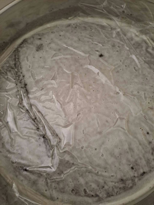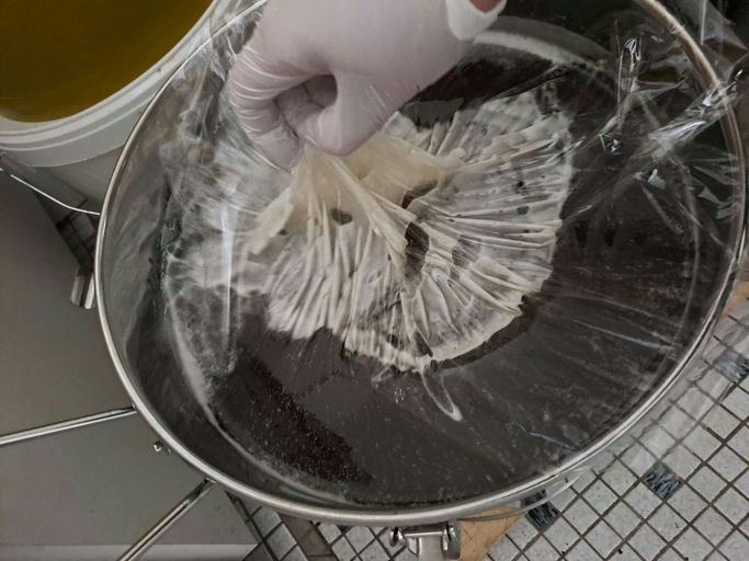 Die Spättracht ist geschleudert. Im Anschluss muss der Honig abgeschäumt werden. Schaum sammelt sich nach dem Schleudern an der Oberfläche. Um diesen zu entfernen, kann man einen Teigschaber oder Klarsichtfolie nutzen. Hierzu lege ich die Folie auf der Oberfläche ab und ziehe diese dann inklusive dem Schaum ab. Das Ergebnis ist ein klarer Honig.