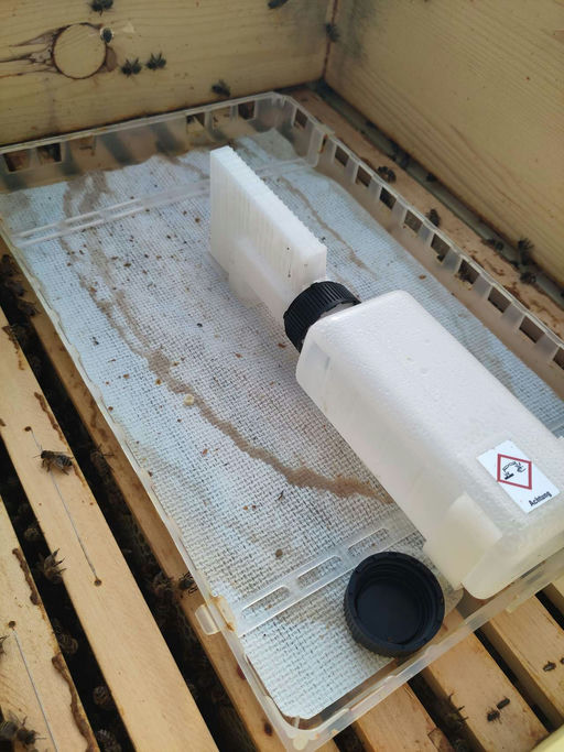 Dieses Jahr wird der Varroabefall ständig kontrolliert und entsprechend werden Maßnahmen ergriffen. Die Varroamilbe ist ein Parasit, der sich in der Bienenbrut vermehrt und deren Blut saugt. Dadurch werden junge Bienen geschädigt und es werden häufig verschiedene Krankheiten übertragen. Die Imkerschaft hat deshalb seit der Einfuhr aus Asien ein Auge auf diesen Parasiten, und es hat sich herausgestellt, dass eine Befallskontrolle anhand des natürlichen Totenfalls (im Boden) die besten Ergebnisse liefert. Falls gewisse Grenzwerte überschritten werden – im August etwa 10 Milben pro Tag –, muss schleunigst mit Ameisensäure behandelt werden. Ich verwende hierzu einen Verdunster, der unabhängig von der Temperatur über lange Zeit ein wenig dieser Säure verdunstet und so die Varroamilbe nachhaltig schädigt. Natürlich ist diese Behandlung für die Bienen nicht gerade angenehm, aber sie ist überlebenswichtig. Ich vergleiche diese Behandlung immer mit einer lebensrettenden Chemotherapie – sie mag zwar nicht angenehm sein, sichert jedoch das Überleben.