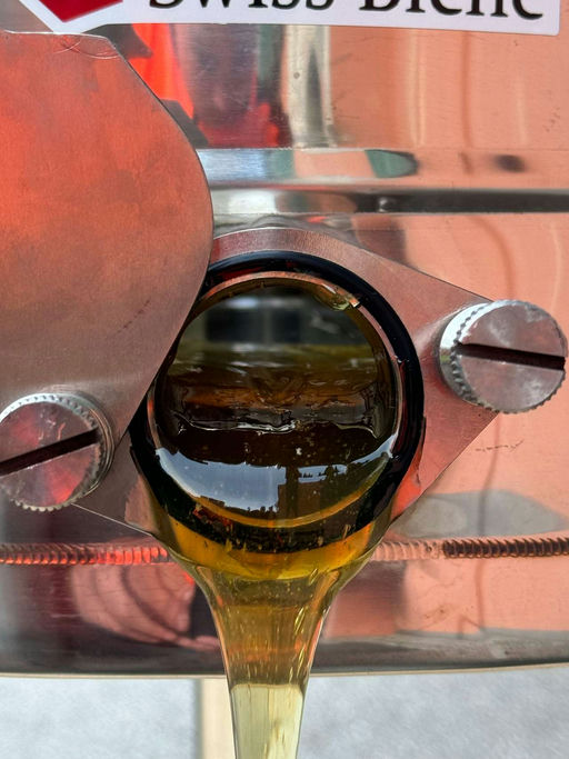 Mit einem Wassergehalt von 17 % liegt er hervorragend in der Norm. Nach der österreichischen Honigverordnung ist nur ein Wassergehalt von bis zu 20 % zulässig. Ziel sollte allerdings immer ein Wert von unter 18 % sein. Sobald man den Quetschhahn öffnet, merkt man jedoch sehr schnell, ob er unter 20 % liegt. Denn wenn er wie Wasser aus der Schleuder rinnt, ist er noch nicht reif! Wenn er sich jedoch auftürmt und alle Waben zu zwei Dritteln gut mit Wachs verdeckelt sind, dann liegt der Wassergehalt ziemlich sicher unter 18 %. 🐝🍯 Nach dem Schleudern ist vor dem Abfüllen. Bis dahin darf der Honig aber erst einmal ein bis zwei Tage in den Eimern ruhen. Und dann ist er auch schon bereit zum Abfüllen.