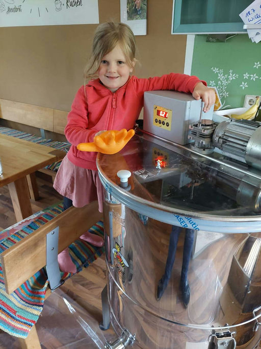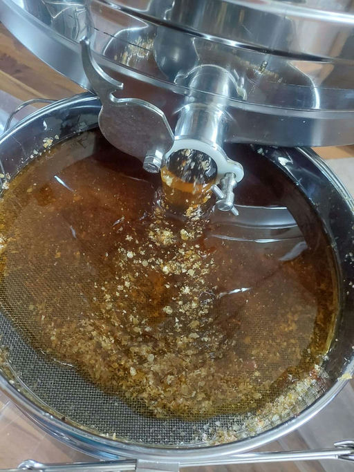 Da der Honig ein Lebensmittel ist, müssen der Schleuderraum und die Geräte sauber und hygienisch sein. Danach kann es losgehen: Heuer hatten wir tatkräftige Unterstützung von unserer Nichte. Zuerst werden die Waben entdeckelt, d. h., die Wachsschicht, die die Honigzellen verschließt, wird entfernt. Dann werden die entdeckelten Waben in die Honigschleuder eingesetzt und durch Drehen in Bewegung versetzt. Die Zentrifugalkraft schleudert den Honig aus den Zellen. Danach wird der geschleuderte Honig durch ein Sieb gefiltert, um Wachsreste und andere Verunreinigungen zu entfernen. Der gefilterte Honig muss noch einige Zeit stehen bleiben, bevor er in Gläser abgefüllt, etikettiert und verschenkt bzw. verkauft wird.