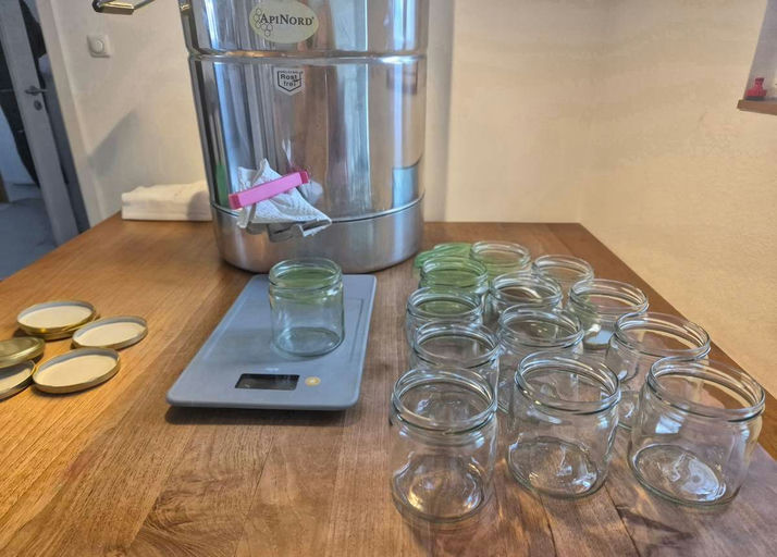 Seit zwei Monaten steht der geschleuderte und gesiebte Honig nun schon hier und wird regelmäßig gerührt. Natürlich muss das süße Gold jetzt noch in die Gläser. Immer wieder bekomme ich Anfragen aus dem Kolleg:innen- und Freundeskreis, ob ich denn schon Honig habe. Auch der Wabenhonig wird dieses Jahr vereinzelt angefragt.