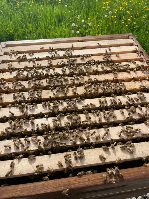 Anfang Mai werden langsam die Honigräume gefüllt. Leider war es bis jetzt noch etwas zu kühl, sodass die Bienen eher gemächlich eingetragen haben. Aber abgerechnet wird ja bekanntlich erst Ende des Jahres. Die Königinnen legen jetzt die Maximalzahl ihrer Eier. Bei meinen Buckfast-Völkern sind jeweils nur sechs Brutwaben in jeder Beute. Diese sind aber voll bestiftet. Für die Königin reicht diese Anzahl Rähmchen beim Dadant vollkommen aus.