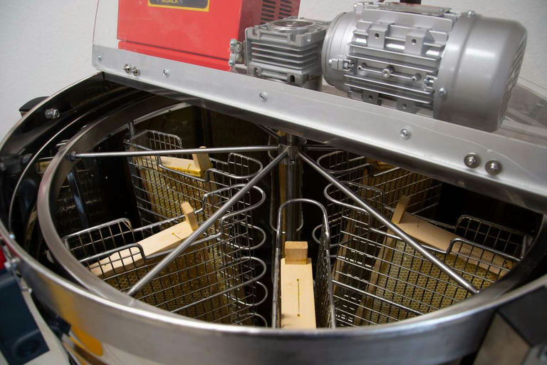 Zuerst wird das Deckelwachs mit einem Heizmesser entfernt und anschließend in der Honigschleuder ausgeschleudert. Die Honigschleuder funktioniert wie eine Art Zentrifuge, in der der Honig an die Seitenwände gedrückt wird. Ich arbeite mit einer automatischen Selbstwendeschleuder, in der ich sechs Rähmchen einhängen kann.