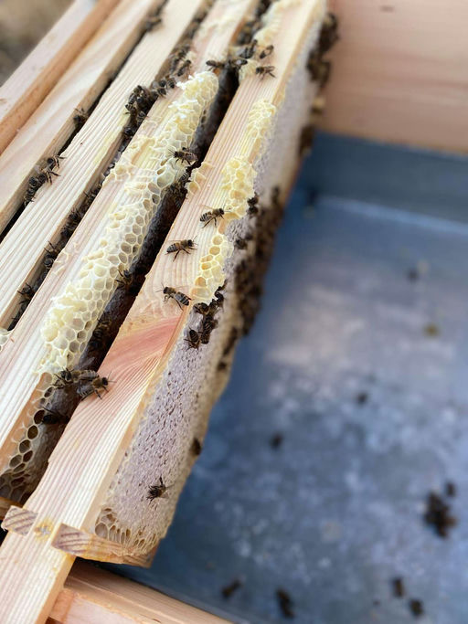Endlich ist es soweit: Der Biohonig kann geerntet werden. Dazu legen wir am Vortag Bienenfluchten ein. So können die Bienen nur noch nach unten aus dem Honigraum heraus, aber nicht mehr hinein. Dadurch können am nächsten Tag die Rähmchen entnommen werden, ohne den Bienen zu schaden.