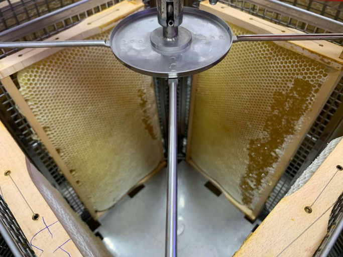 Im Juni und Juli stand die Honigernte an, und generell war dieses Jahr ein gutes Erntejahr. Wir haben in unserer Honigküche fleißig die Waben entdeckelt und geschleudert. Der Honig wird aus der Schleuder direkt durch zwei Siebe in Eimer abgefüllt. Je nach Honigsorte beginnt dann die Kristallisation des Honigs. Um ihn cremig zu bekommen, wird der Honig zweimal am Tag mit einem Handrührwerk durchgerührt, wodurch die Kristalle gebrochen werden. Im richtigen Moment muss dann in die Gläser abgefüllt werden. Honige wie der von der Robinie bleiben flüssig und können direkt abgefüllt werden.
