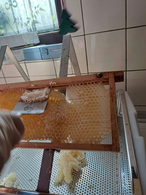 Anfang Juni war es dann auch endlich soweit: Ich habe die Frühtracht geschleudert. Hierzu habe ich einen Tag vorher die Bienenfluchten eingelegt. Die Bienen verlassen so von ganz allein die Honigräume, und als dann Schleudertag war, konnte ich die Honigräume einfach abnehmen. Die wenigen noch verbliebenen Bienen habe ich vorsichtig von den Honigwaben abgefegt. Nachdem alles im Keller war, wurde Wabe für Wabe entdeckelt und geschleudert. Da ich nicht mit den Völkern wandere, war ich dieses Jahr mehr als überrascht, dass die diesjährige Frühtracht so weiß ist und somit sehr viel Raps enthält, wenn nicht sogar ein reiner Rapshonig ist.