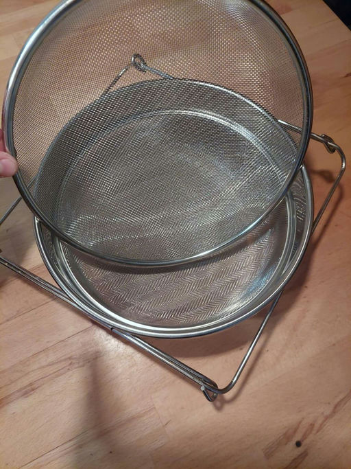 Das Doppelsieb besteht oben aus einem gröberen und einem feinen Sieb. Im oberen, gröberen bleiben größere Wachsreste hängen, mit dem unteren werden auch feine Teilchen ausgesiebt. Da das Sieb relativ schnell verschmutzt und somit „verstopft“, muss es mehrmals getauscht bzw. gereinigt werden.