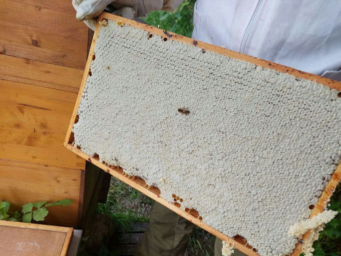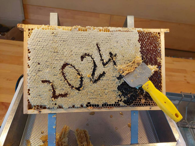 Mit einer sogenannten Entdeckelungsgabel wird jedes Rähmchen entdeckelt. Dabei wird das Entdeckelungswachs entfernt, um den Honig ausschleudern zu können. Dieser Wachsdeckel auf den Rähmchen ist ein Zeichen dafür, dass der Honig reif ist. Das heißt, der Wassergehalt im Honig ist unter 17 %. Das ist wichtig, damit der Honig nicht vergärt und lange haltbar bleibt. Den genauen Wassergehalt kann man mit einem Refraktometer ermitteln. Vorab haben wir außerdem durch die Spritzprobe sichergestellt, dass der Honig erntebereit ist. Dabei nimmt man eine unverdeckelte Wabe und bewegt sie ruckartig nach unten. Spritzt Nektar aus der Wabe, ist der Honig noch zu nass.