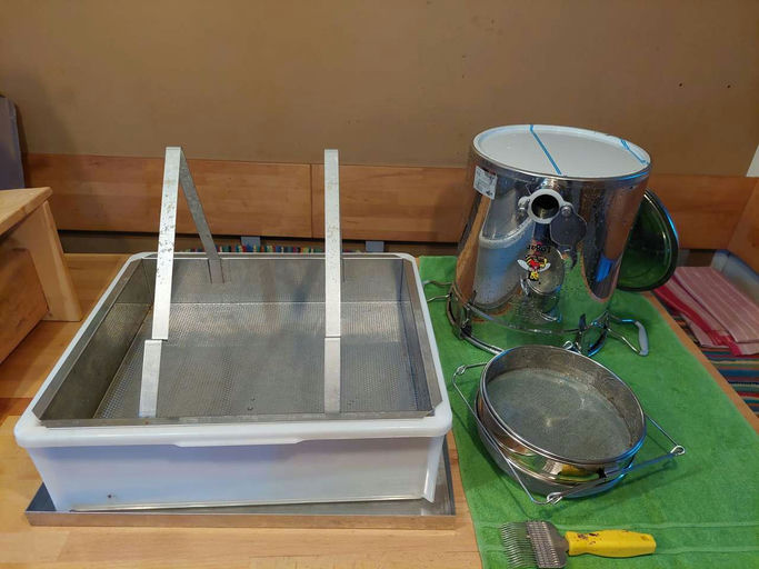 Nachdem wir zeitig in der Früh die Honigschleuder, das Entdeckelungsgeschirr, die Abfülltöpfe und Lagerbehälter vorbereitet hatten, sind wir zum Bienenstand gefahren und haben die Honigzargen abgeholt. Die nur sehr wenigen Bienen, die dank der Bienenfluchten noch auf den Honigrähmchen saßen, haben wir abgekehrt und alles in die mitgebrachten Zargen umgeschlichtet.