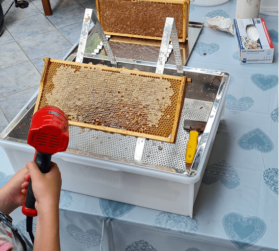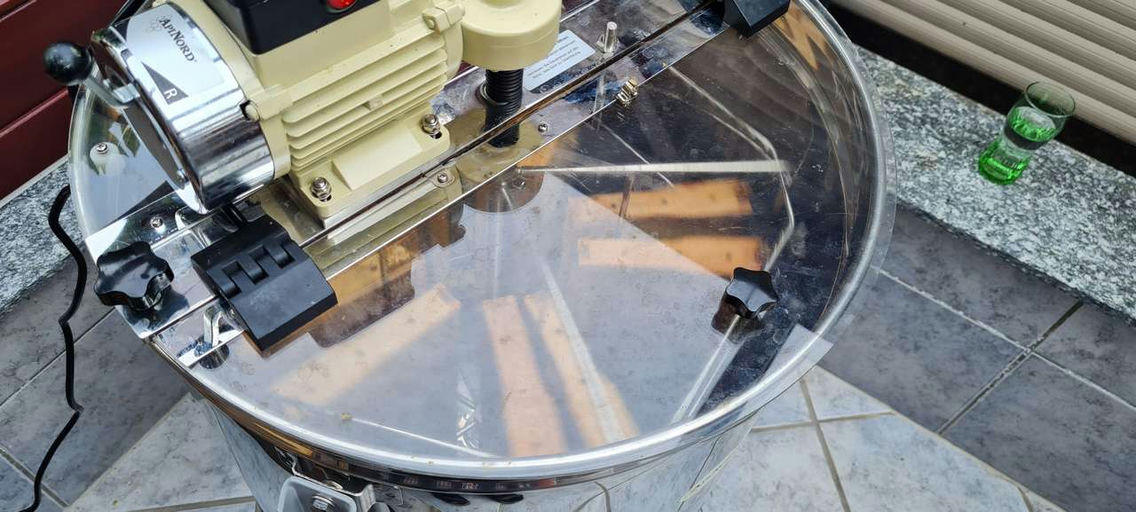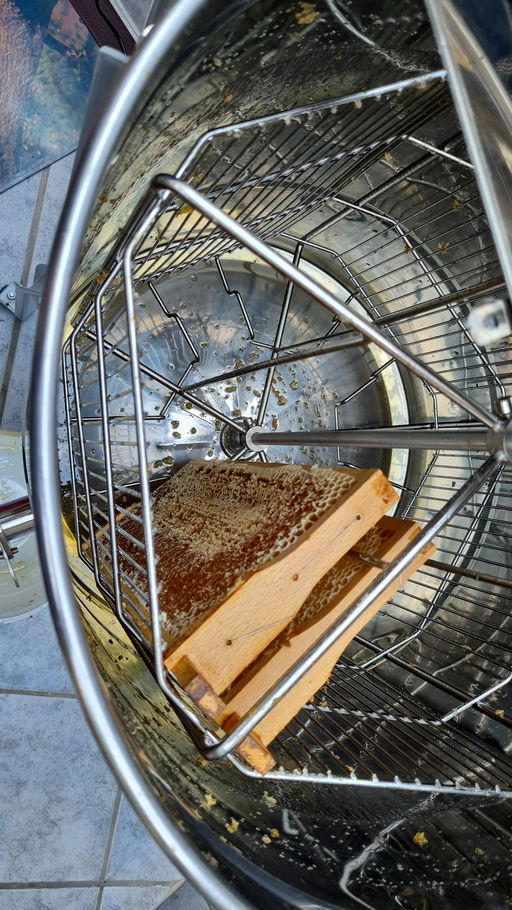 Am nächsten frühen Morgen setze ich die Honigräume ab und bringe sie in meinen Schleuderraum, der schon vorbereitet auf uns wartet. Dort werden wir die Honigwaben entdeckeln und sie in die Schleuder platzieren. Jeder Schleuderdurchgang dauert etwa 5 Minuten, und der Honig wird aus den Waben gedrückt und fließt unten in den Sammelbehälter. Nach dem Schleudergang lassen wir den Honig in einen Honigeimer abfließen und sieben ihn, damit alle Fremdgegenstände, die nicht in den Honig gehören, herausgefiltert werden, z. B. Bienen, Pollenreste etc.