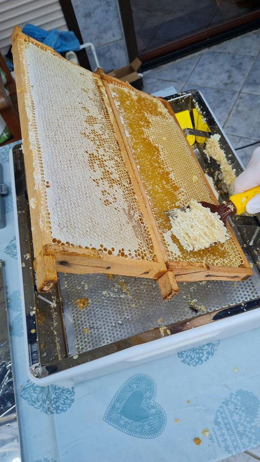 Diesen Monat ernten wir unseren Frühlingsblütenhonig, den die Bienen von März bis Mai gesammelt haben. Bevor wir mit der Ernte beginnen, mache ich zunächst eine Qualitätsprobe. Wir entnehmen mehrere kleine Proben, um den Wassergehalt zu messen, der unter 18 % liegen sollte. Aktuell haben wir einen Wassergehalt von 16,4 % gemessen und können mit unserer Ernte beginnen.