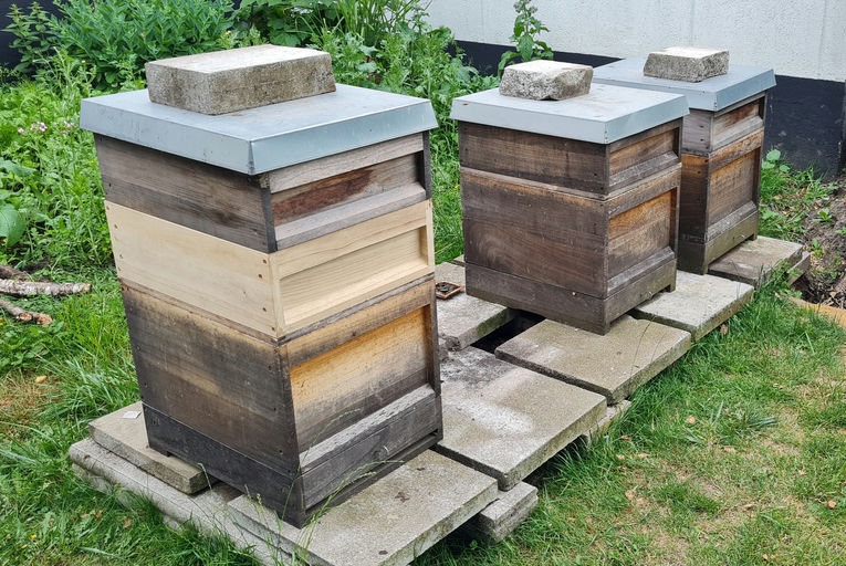 Zunächst setzen wir einen Tag vorher eine sogenannte Bienenflucht ein. Diese soll bewirken, dass die Bienen aus dem Honigraum in den Brutraum wandern, damit wir am nächsten Tag ohne Stress die Honigräume zum Schleuderraum bringen können. Die Bienenflucht funktioniert wie eine Einbahnstraße: Die Bienen können nicht mehr in den Honigraum zurück, aber vom Honigraum in den Brutraum. Sobald wir dies aufgesetzt haben, heißt es warten, und wir können am nächsten Tag mit der Ernte beginnen.