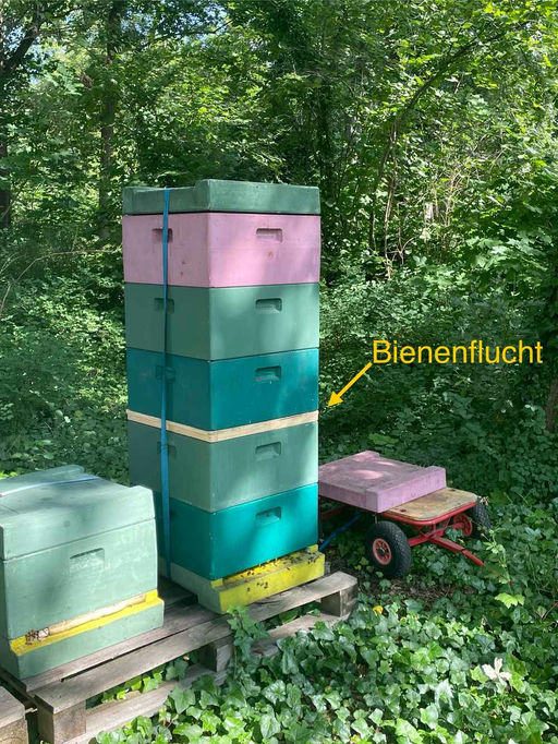Es ist soweit: Die letzte große Tracht, die Linde, ist durch, die Honigräume sind prall gefüllt und die „Honigernte“ kann erfolgen. Um es mir einfach zu machen und vor allem möglichst bienenschonend zu arbeiten, habe ich vor zwei Tagen eine Bienenflucht zwischen Brutraum und Honigraum eingesetzt. Eine Bienenflucht ist ein Bauteil, das in eine Holzplatte eingebaut ist, bei dem auf der Oberseite ein sehr großer Eingang, auf der Unterseite aber nur ein sehr kleiner Ausgang ist. Die Bienen, die oben im Honigraum sitzen, bekommen durch die Holzplatte deutlich weniger Königinnengeruch, Pheromone, als vorher und nähern sich daher der Bienenflucht, durch die immer noch Geruch strömt. Um mehr Königinnengeruch zu erhalten, passieren sie den großen Durchgang und gelangen in den Brutraum. Da vom Brutraum nur ein ganz kleiner Durchgang nach oben besteht und von dort kein Königinnengeruch kommt, versuchen sie nicht wieder nach oben, also in den Honigraum, zu gelangen. Mit ein bisschen Geduld leert sich somit auf einfache Weise der Honigraum von Bienen. Und der Imker kann nach ca. zwei Tagen den Honigraum ganz entspannt abnehmen und zu seinem Schleuderraum bringen.