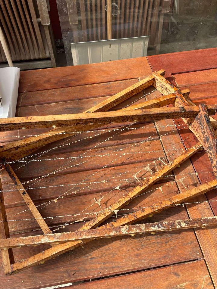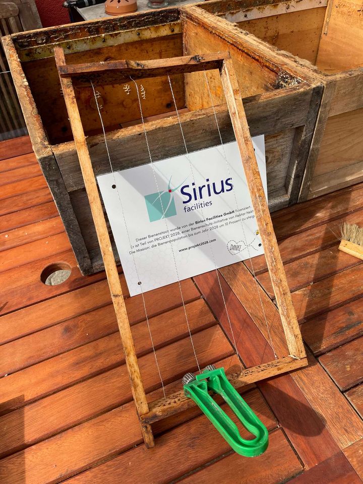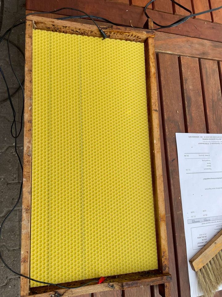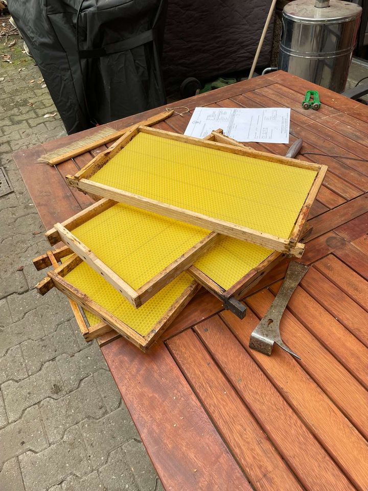 Unsere 'alten' Völker fliegen und sammeln wie wild. Wir haben die Sonnentage zur Vorbereitung genutzt. Die Honigbeuten mussten gereinigt werden, einige Rest-Rähmchen wurden noch eingeschmolzen, beziehungsweise natürlich nur die Waben in den Rähmchen. Die Spannung der Drähte wurde kontrolliert und einige wurden noch fester gezurrt. Die bereits letzte Woche besorgten Wachsplatten konnten wir dann auf die vorbereiteten Rähmchen löten. Dann endlich konnten die vorbereiteten Honigräume aufgesetzt werden. Fertig!