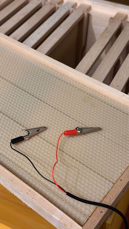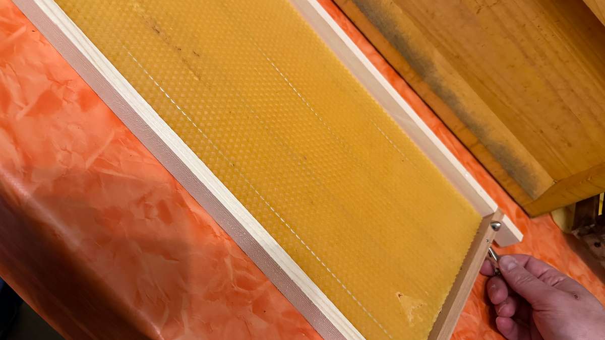 Damit die Mittelwände stabil im Rähmchen befestigt sind, wird der Draht kurz mit Strom erwärmt. Dadurch verschmilzt die Mittelwand mit dem Draht und die Bienen können ungehindert ihren Wabenbau darauf erstellen.