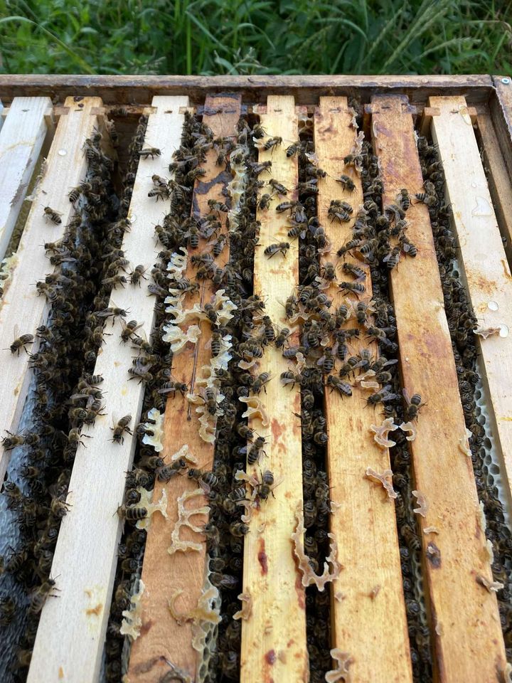 Nach Anfangsschwierigkeiten und der Nichtannahme des Honigraumes aufgrund des instabilen Wetters Anfang Juni haben meine Bienen diesen nun doch angenommen. Das Wetter ist mittlerweile warm und sehr stabil, und sie sammeln fleißig Nektar und Pollen ein. Bei der Nachkontrolle vor etwa zwei Wochen haben sie im Honigraum bereits prächtig Honig eingebracht, und auch die Ableger entwickeln sich sehr gut. Anbei die Bilder zu den Ablegern.