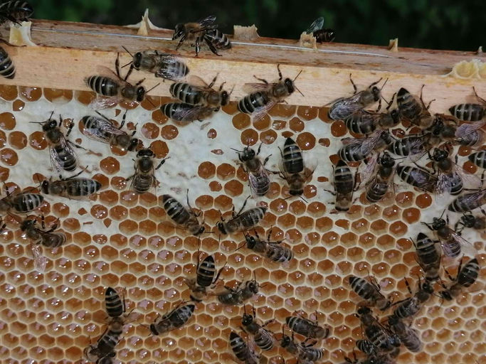 Anfang April habe ich den Honigraum auf den Brutraum gesetzt. Damit die Königin nicht in den Honigraum geht und dort Eier legt, kommt zwischen Brutraum und Honigraum ein sogenanntes Absperrgitter. Der Abstand der Gitterstäbe lässt Arbeiterinnen durch, die Königin ist ein wenig größer und kann nicht hindurch. Für die Honigernte ist es wichtig, dass sich keine Brut in den Honigwaben befindet. Auf dem Bild sieht man eine Honigwabe, die am Rand bereits verdeckelt wird (weißliches Wachs). Derzeit ist in der Stadt der Ahorn in Vollblüte, die Obstbaumblüte ist bereits vorbei.