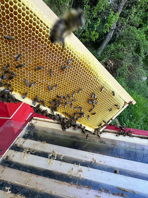 Anfang April und es hat 30°, die Sonne scheint und die Kirsche blüht. Das Bienenvolk ist explodiert. Es ist höchste Zeit, die Honigräume aufzusetzen. Der Drohnenrahmen wird gegeben, um der Königin und den restlichen Damen die Aufzucht von Drohnen zu ermöglichen. Auf dem Bild kann man auch die Stifte (Eier) der Königin in den Drohnenzellen erkennen. Nach wenigen Tagen haben sie bei herrlichem Wetter auch schon die Waben im Honigraum vollgetragen. Wenn das so weitergeht, muss der nächste Honigraum drauf.