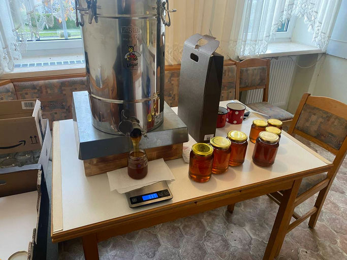 Deshalb wird jetzt Honig für den Verkauf abgefüllt, und ich habe einen Versuch gestartet, Cremehonig herzustellen. Mit ca. 2 kg Rapshonig habe ich dies versucht. Sechs Tage lang habe ich zweimal täglich für fünf Minuten den Honig gerührt. Ich verwendete einen Akkuschrauber mit dem herkömmlichen Quirler eines normalen Mixers. Der Versuch ist geglückt, und der Cremehonig schmeckt vorzüglich. Nächstes Jahr, wenn ich hoffentlich mehr Rapshonig ernten kann, werde ich größere Mengen herstellen. Der heurige Cremehonig wird für Weihnachtsgeschenke verwendet.