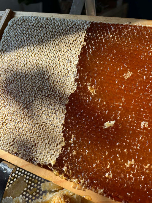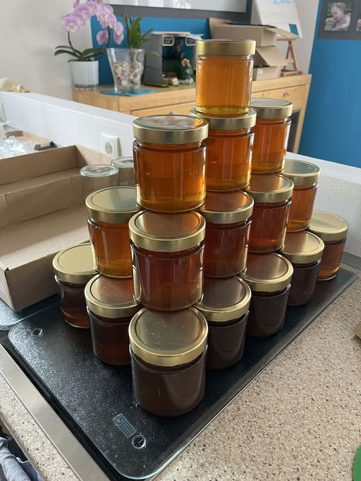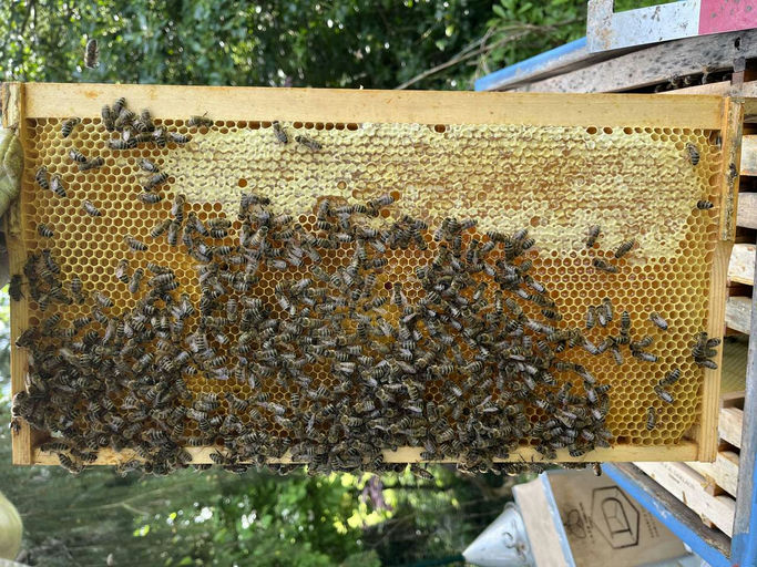 Die im letzten Monat eingetroffenen "Bayerischen" sind fleißig am Bauen sowie am Nektar- und Pollensammeln. Die Beute der Bienen öffnen wir zurzeit nicht, wir lassen ihnen ihre Ruhe. Eine Honigernte werden wir bei diesem Volk erst im kommenden Jahr durchführen. Bei unseren anderen Völkern konnten wir bereits Honig ernten, schleudern und in Gläser abfüllen. Momentan blüht in unserer Region die Linde, die letzte große Tracht in diesem Jahr.