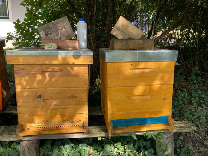 Das neue Bienenjahr hat bereits begonnen – nachdem das Bienenvolk zur Sommersonnenwende seine maximale Stärke erreicht hat, beginnt es, sich auf den Winter vorzubereiten. Für uns Imker bedeutet das auch, ein wachsames Auge auf die Gesundheit des Volkes zu haben. Speziell die Varroamilbe setzt den Bienen zu, und so ist es im Spätsommer wichtig, die Vermehrung der Milbe durch gezielte Eingriffe in Schach zu halten. In den VAV-Völkern kommt Ameisensäure zum Einsatz. Hier sieht man die Behandlung damit: Auf ein Schwammtuch wird Ameisensäure aufgetragen, dieses wird unter das Volk gelegt; bei Temperaturen über 25 Grad verdampft die Säure und kann die Milben angreifen. Der Abfall der Milben und damit die Effizienz der Behandlung können ebenso auf der unten eingelegten Windel beurteilt werden.