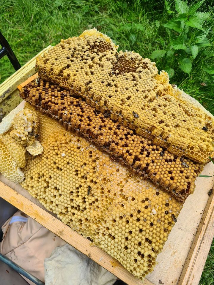 Im Juni befinden wir uns noch immer in der ersten Jahreshälfte, und die Bienenvölker wachsen stetig weiter. Die Blüten der Bäume sind jetzt voll im Gange. Der Imker hat nun viel Arbeit. Es muss die Drohnenbrut geschnitten werden, und je nach Standort kann schon der erste Honig geerntet werden.