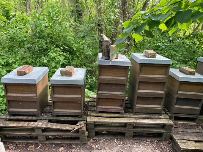 Wie du auf den Bildern sehen kannst, ist das Gelände von einem riesigen Wald und Naturschutzgebiet umgeben. Im direkten Umfeld dominieren Robinien, die gerade anfangen zu blühen. Wenn du genau hinsiehst, kannst du die ersten, weiß blühenden Exemplare schon entdecken. Bienen lieben Robinien. Da macht es sich super, dass wir gestern alle Völker mit einem Honigraum ausgestattet haben. ;) Wenn das Wetter mitspielt, schaffen es die Bienen in den nächsten 2-3 Wochen, alle Honigräume zu füllen. Das wären dann pro Volk bei dem verwendeten Beutenformat ca. 24 kg. Ich finde das eine sehr beeindruckende Leistung. Honig, der überwiegend aus Nektar der Robinien besteht, darf übrigens mit der Bezeichnung „Akazienhonig“ verkauft werden, da die Robinie zu den Scheinakazien zählt.