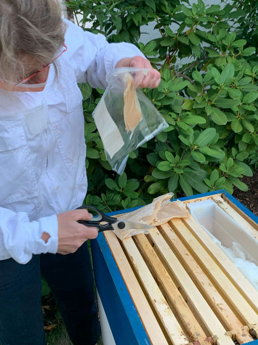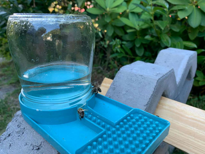 Noch ist es heiß, doch endlich hat es am Ende der letzten Woche geregnet – eine Wohltat für uns alle. Zwischendurch war es so heiß, dass ich die Völker beschatten musste (ein Sonnenschirm musste herhalten) und ihnen zusätzlich Wasser mit einer Tränke angeboten habe, die verhindert, dass Bienen ertrinken. Das gelingt ganz gut, aber sie trinken an ganz anderer Stelle als vorgesehen.