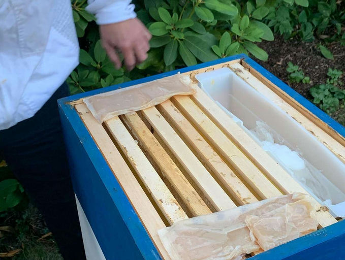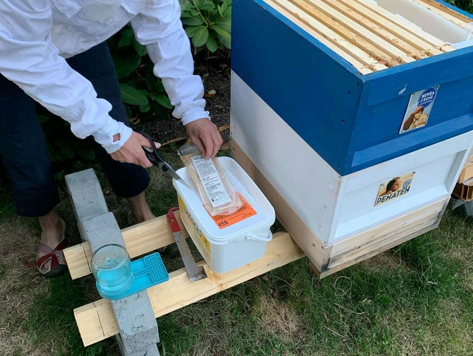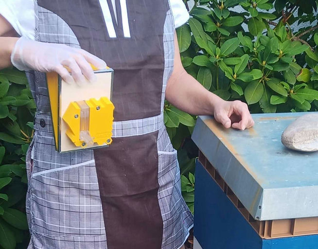 Ich habe bei dem Ableger mit der Varroabehandlung begonnen, einen Monat später als beim stärkeren Sirius-Volk. Im Projekt 2028 wollen wir die Bienenpopulation um 10 % steigern. Das kann man mit guter Behandlung der bestehenden Völker und dem Teilen bzw. Ableger bilden erreichen. Damit nutzt man den natürlichen Trieb der Bienen aus, sich teilen zu wollen. Hilft man dabei, kann man das Schwärmen verhindern (viele Schwärme werden nicht eingefangen und gehen meistens ein), das Überleben sichern und die Population vergrößern. Auf den Bildern seht ihr, wie ich beim Schwarm Streifen einlege, die aus meiner Sicht Vorteile gegenüber der Verdunstung mit dem Nassenheider haben. Ich habe die Streifen sechs Tage drin gelassen. In fünf Tagen habe ich eine adulte Milbe auf dem Schieber gefunden und dann die Behandlung gestoppt, denn die Belastung kann dann nicht hoch sein. Ihr seht mich auf einem Bild mit dem neuen "Rauch Smoker" Apisolis, den ich mir geleistet habe – kein echtes Verbrennen, keine Funken, kein Geruch, nur Dampf (wie bei einer E-Zigarette) – und die Bienen reagieren wie auf echten Rauch. Fantastisch.
