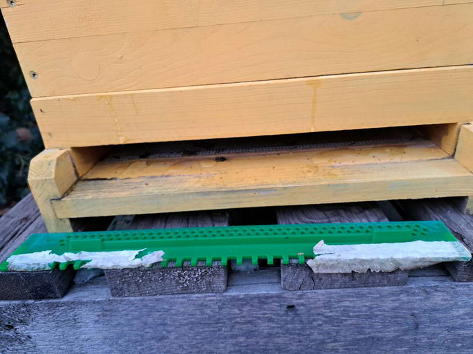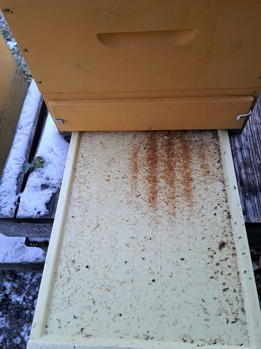 Die Fluglochverkleinerungen habe ich entfernt, damit die Öffnungen für folgende Reinigungsflüge frei sind. Teilweise haben sich die süßen Tiere durch meine Fluglochverkleinerung durchgearbeitet. Auf den eingelegten Windeln sehe ich den Sitz der Bienen und den Müll, der aus Wachsresten besteht. Dazwischen ist kaum Varroa zu bemerken, was erfreulich ist. Am Boden konnte ich nur vereinzelt tote Bienen finden. Das ist ein gutes Zeichen für mich, dass sie einen guten Putztrieb haben, d. h., sie sind meine fleißigen Bienen.