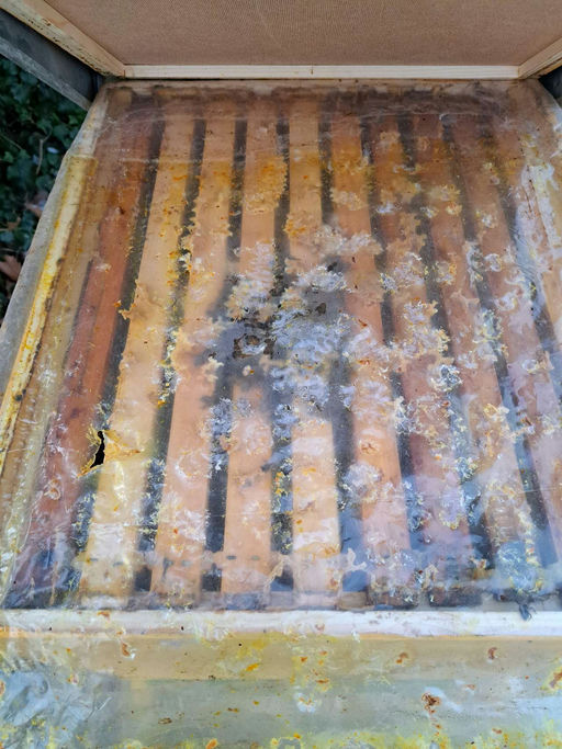 Die Fluglochverkleinerungen habe ich entfernt, damit die Öffnungen für folgende Reinigungsflüge frei sind. Teilweise haben sich die süßen Tiere durch meine Fluglochverkleinerung durchgearbeitet. Auf den eingelegten Windeln sehe ich den Sitz der Bienen und den Müll, der aus Wachsresten besteht. Dazwischen ist kaum Varroa zu bemerken, was erfreulich ist. Am Boden konnte ich nur vereinzelt tote Bienen finden. Das ist ein gutes Zeichen für mich, dass sie einen guten Putztrieb haben, d. h., sie sind meine fleißigen Bienen.