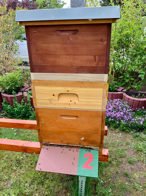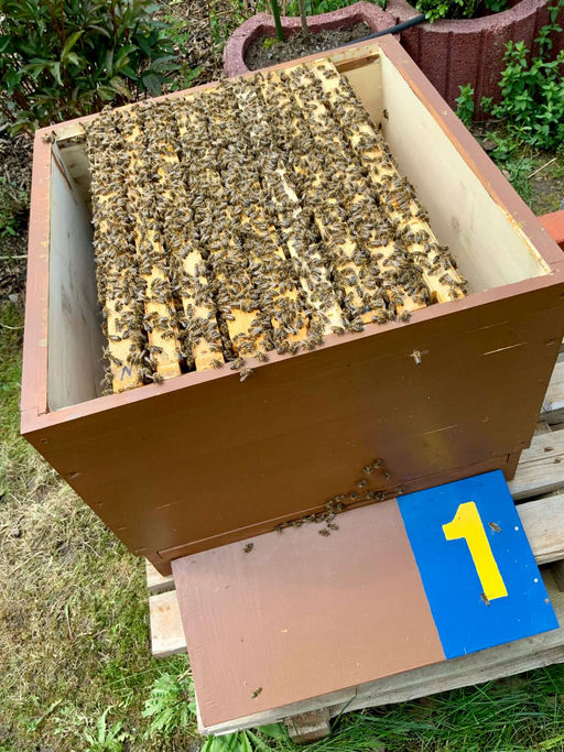 Ich bilde aus dem schwarmfreudigen Volk einen sogenannten Flugling und einen Brutling, wie ihr hier auf dem Foto gut sehen könnt. Unten sitzt das „alte“ schwarmfreudige Volk mit zwei Brutwaben inklusive offener Brut in dem sogenannten „Flugling“. Darüber setze ich einen Honigraum und darauf einen geschlossenen Zwischenboden mit einem Flugloch (180 Grad gedreht), sodass die Bienen auf der anderen Seite ausfliegen können. Auf diesen kommt dann die Beute, der sogenannte „Brutling“ mit den Brutwaben und der „alten“ Königin. Sämtliche dort ausfliegenden Bienen fliegen nun zurück in die untere Beute, den „Flugling“. Die Königin hat oben somit keine Flugbienen mehr und will daher nicht mehr schwärmen. Unten im „Flugling“ ziehen sich die Bienen eine neue Königin und tragen weiterhin Honig ein. Es hat wunderbar funktioniert! Nach etwa 10 Tagen habe ich die „alte“ Königin mit ihrem Volk an einen anderen Platz in meinem Garten gestellt. Der Schwarmtrieb war somit erloschen! Der Flugling hatte sich erfolgreich eine neue Königin gezogen und nach 14 Tagen hat diese Königin bereits fleißig Eier gelegt. Somit ein perfekter Ableger mit Honigertrag.