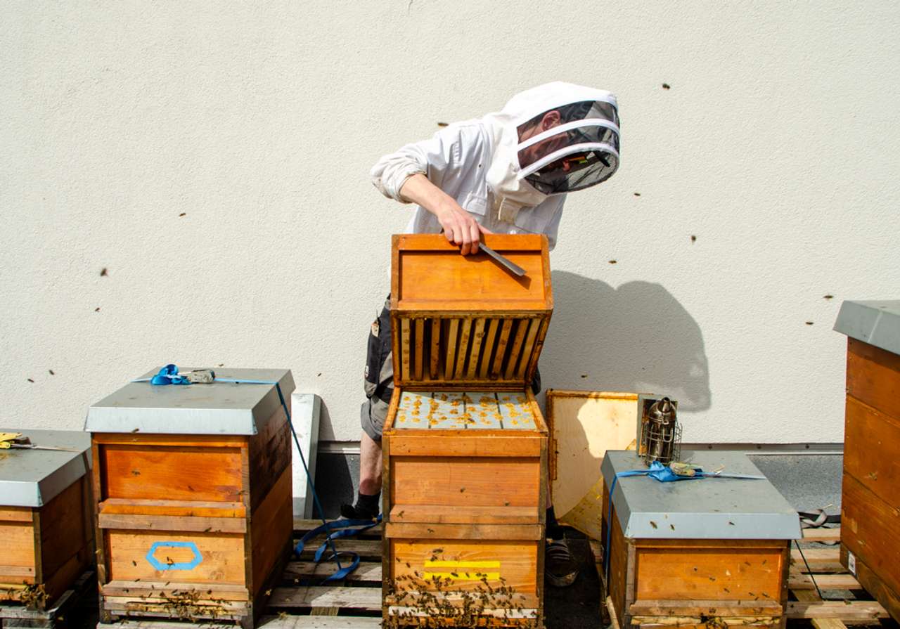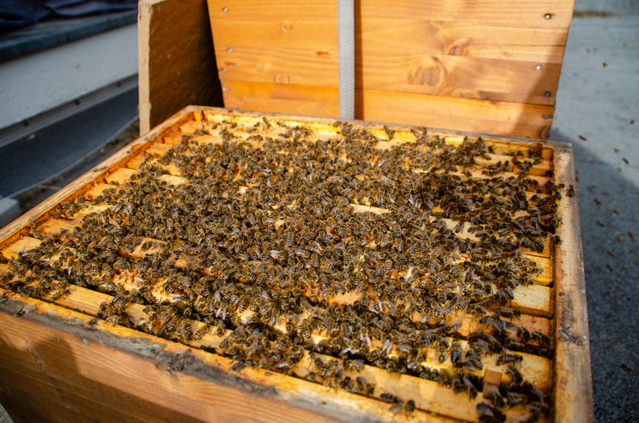 Der Aprilanfang war richtig warm. Es herrschten teilweise Temperaturen wie im Sommer. Auf die Kirschblüte folgt alsbald auch der Raps, der an unserem Standort eine Menge Nektar in kurzer Zeit liefert. Da der März optimale Bedingungen für eine frühe Völkerentwicklung brachte, sind die meisten Völker schon sehr stark und platzen bald aus allen Nähten. Nun brauchen die Bienen viel Platz in ihrem Stock für Brut, Pollen und den ganzen Nektar. Würden wir sie in diesem Zustand belassen, dann erwacht in ihnen der natürliche Drang zu schwärmen, das Volk zu teilen, damit wieder genug Platz da ist. Das ist der ganz normale Vermehrungstrieb der Honigbiene. Wir können sie allerdings beruhigen, indem wir dafür sorgen, dass wieder Raum zum Bauen und Nektar einlagern da ist. Dazu setzen wir rechtzeitig die Honigräume auf die Völker, damit sie sich weiter ungehindert entwickeln können. Leider sanken die Temperaturen Mitte April wieder gewaltig, nachts auch bis hin zum Gefrierpunkt. Der Bienenbetrieb reduziert sich wieder drastisch und die Völker können den massenhaften Nektar nicht mehr nutzen. Da ein Bienenvolk im April rund 5 kg Futter in der Woche für die Bruttätigkeit benötigt, ist nun wieder das wachsame Auge der Imker*innen gefragt, um bei Futtermangel sofort reagieren zu können.