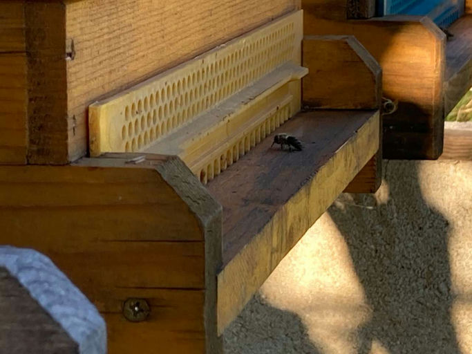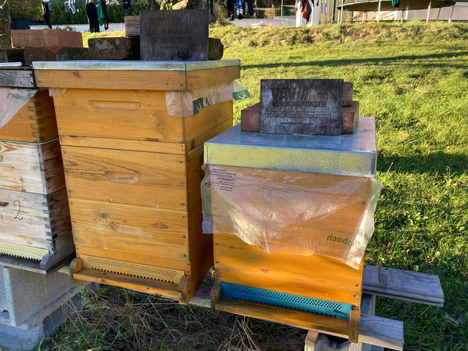 Und damit beginnt endgültig die Zeit, in der die Bienen im Stock bleiben. Anfang November gab es noch einige wärmere Tage, an denen man die VAV-Bienen am Flugloch beim Ein- und Ausfliegen beobachten konnte. Aber man merkt auch, dass die Bienen von ihren Ausflügen kaum noch Nahrung mitbringen, da kaum noch blühende Pflanzen zu finden sind: Es sind keine Pollenhöschen mehr zu sehen. Wir wünschen den VAV-Bienen einen guten Start in die kalte Jahreszeit!