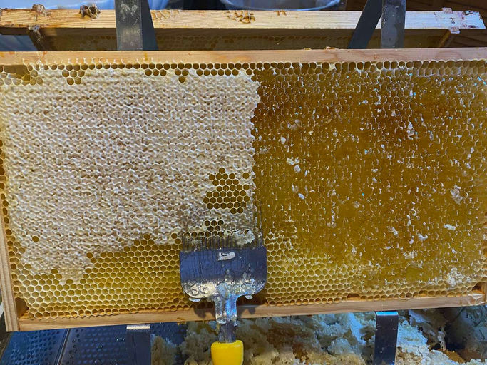 Anfang Juni ist es endlich soweit und der Honig kann geschleudert werden. Eine Bienenflucht wird am Vortag unter dem Honigraum angebracht. Die Bienen können den Honigraum verlassen, finden jedoch den Weg zurück zum Honigraum nicht mehr. Somit ist die Honigbeute am nächsten Tag fast bienenleer und das Entnehmen der Honigräume ist nun ein Kinderspiel. Im Schleuderraum werden die Honigwaben entdeckelt und mit der Schleuder der kostbare Honig entnommen. Mit zwei Sieben werden Wachsreste aus dem Honig gefiltert und der Honig wird in Eimern abgefüllt. Nun muss der Honig reifen bzw. kristallisieren. Mehr im nächsten Blog.