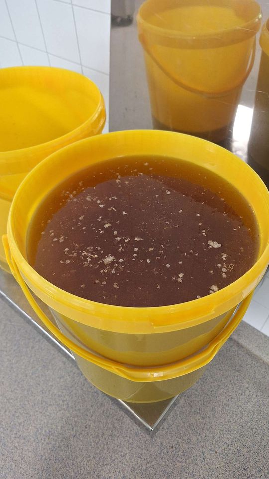 Die gefüllten, in Teilen verdeckelten Rähmchen aus dem Honigraum wurden in der Honigschleuder ausgeschleudert. Dieser Geruch – einfach herrlich! Der aus der Schleuder auslaufende Honig läuft immer durch zwei Siebe, um Fremdteile oder grobe Wachsbestandteile herauszufiltern. Im großen Eimer wird der Honig nun mehrmals täglich gerührt, damit er, sobald er cremig genug ist, in Gläser abgefüllt werden kann. Das wird aber noch ein paar Tage dauern!