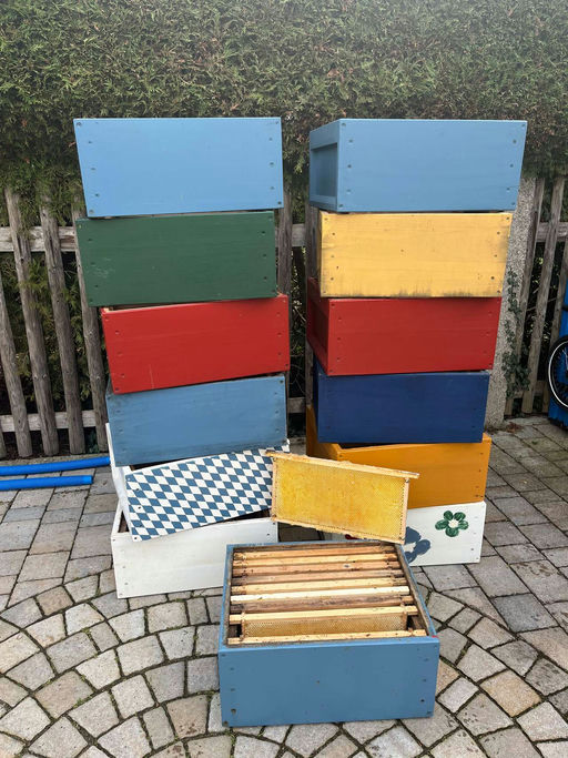 Jetzt, kurz vor Ostern, fängt bereits die Kirsche an zu blühen. Ab dieser Zeit finden unsere Bienen in der Regel genug Nektar, um davon leben zu können. Mit Beginn der Kirschblüte werden die Honigräume wieder aufgesetzt. Der "Honigraum" ist in unserer Betriebsweise eine Zarge mit 10 Rähmchen. In der Mitte werden ca. 4-5 bereits ausgebaute Waben aus dem Honigraum des Vorjahres platziert, und an den Rändern kommen Rähmchen mit Mittelwänden, die wir in den Vormonaten hergestellt haben. Der Honigraum wird über einem Absperrgitter auf den Brutraum gesetzt.