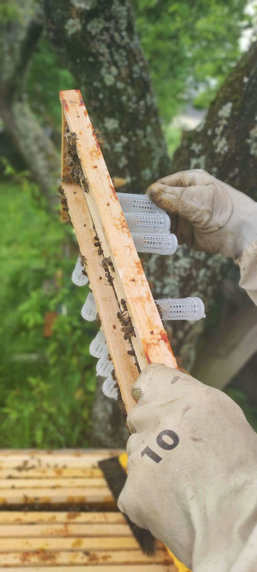 Trotz des nicht idealen Wetters wurde heute der Brutableger kontrolliert, um zu sehen, ob die Larven angenommen wurden. Was soll ich sagen, beim ersten Versuch überhaupt wurden 10 von 20 Larven angenommen und schöne Königinnen- bzw. Weiselzellen gebaut. Diese wurden sofort gekäfigt, damit die erste schlüpfende Königin die anderen nicht abstechen kann. Ich bin gespannt...