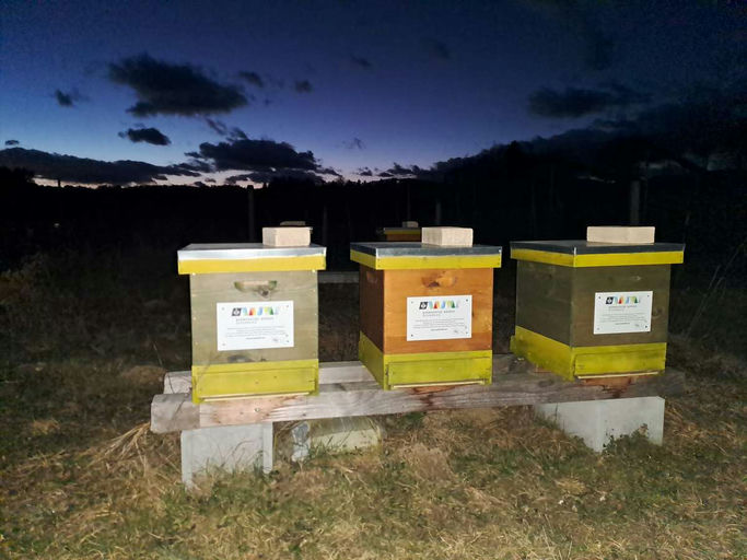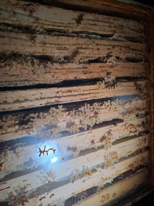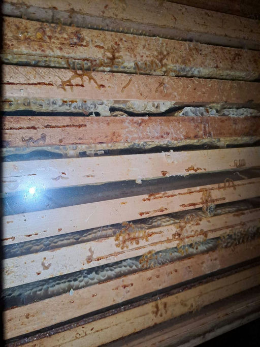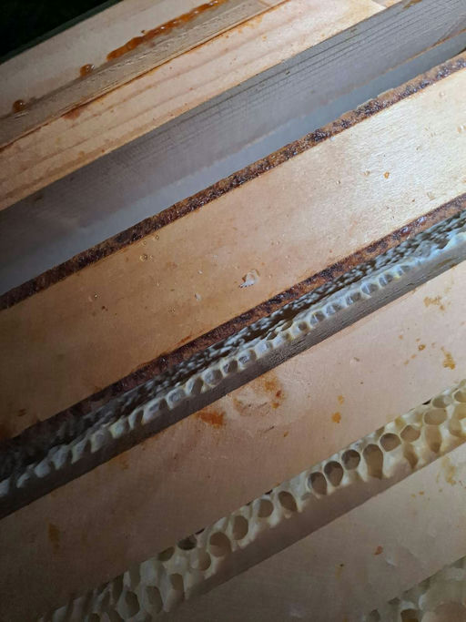 Wir haben kurz vorbeigeschaut, ob bei den Beuten und dem Stand alles in Ordnung ist. Einen kurzen Blick hinein zwecks Futterkontrolle konnte ich nicht unterlassen. Der Futterstand ist soweit in Ordnung, die Bienen haben eine enge, kleine Traube gebildet.