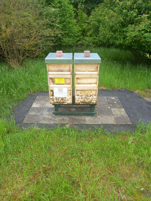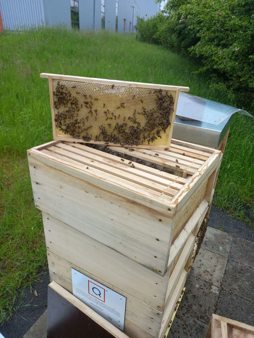 Gleichzeitig färben sich die Rapsfelder in der Umgebung des QVC-Geländes immer mehr in der Farbe „gelb“. Ein starkes Bienenvolk mit vielen Bienen und ein Nahrungsangebot mit einem riesigen Rapsfeld in direkter Umgebung bieten ideale Bedingungen, um eine gute Honigernte zu erwarten. Vorsorglich hat der Imker schon einen zweiten Honigraum je Volk vorbereitet. Oftmals tragen die Bienen bis zu zwei Kilogramm Nektar ein und verarbeiten diesen zu Honig. Da muss dann stets genügend Platz in der Bienenbeute sein, hier im Honigraum, um den Honig zu speichern. Unmittelbar bevor der erste Honigraum voll ist, kann der zweite Honigraum aufgesetzt werden.