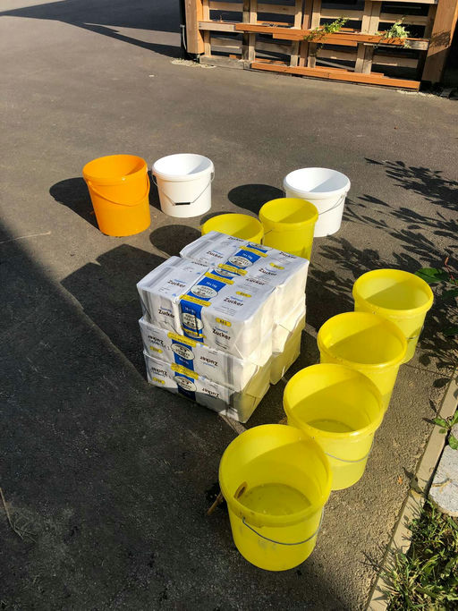 Unsere D.A.S. RECHTSSCHUTZ AG Bienen erhalten jetzt noch eine letzte Fütterung, damit die Wintervorräte aufgefüllt sind. Ein paar Pollen als „Kraftfutter“ finden sie trotz des mittlerweile kühlen Wetters in unserem Bienengarten. Wenn Ende nächster Woche das letzte notwendige Futter im Bienenvolk ist, kann im Oktober die zweite Behandlung gegen die Varroa-Milbe durchgeführt werden.