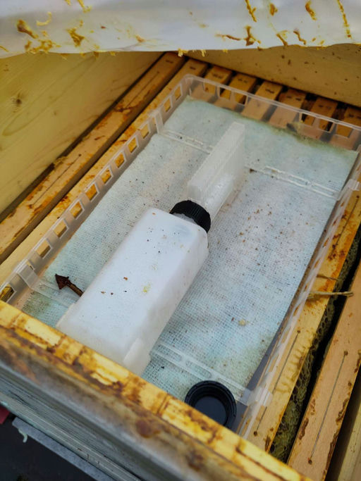 Behandelt wurde wie immer mit Ameisensäure – eine natürliche Säure, die auch von Ameisen als Abwehrsäure produziert wird. Diese Säure hat einen sehr beißenden Geruch und sollte daher weder eingeatmet noch auf die Haut und schon gar nicht in die Augen gelangen. Das kontinuierliche Verdunsten dieser Säure führt dazu, dass die Dämpfe die Varroamilbe abtöten, während sie für die Bienen unangenehm, aber nicht tödlich sind.
