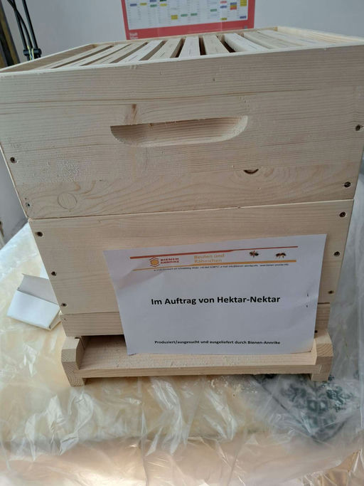 Mit großer Freude erhielt ich Anfang Mai, gerade während ich an meinem Bienenstand war, den Anruf, dass ich heuer wieder mit einem Volk über die VAV Versicherung am Projekt 2028 teilnehmen darf. Kurz danach erhielt ich die Bestätigungsmail, und schon nach ein paar Tagen stand das Paket mit einem Boden, zwei Flachzargen, einem Deckel und einem Blechdach, alles wunderschön ausgearbeitet von der Firma Bienen Annrike, vor mir. Die Zargen sind Flachzargen mit Falz und seitlichen Griffen, was die Arbeit beim Abheben der Zargen enorm erleichtert. Auch die Rahmen sind sehr schön ausgearbeitet – tolle Arbeit vom Tischler Annrike. Beim Transport über DPD ist alles fehlerfrei angekommen, da die Tischlerei alles sorgfältig eingepackt hat. Das gesamte Paket wiegt etwa 25 kg.
