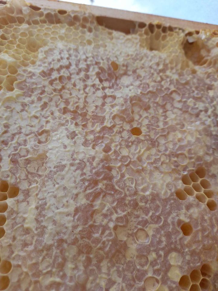 Die Waben sind voll mit Futter, also dem Honig, den die Bienen im Vorjahr noch fleißig gesammelt haben. Leider fehlten wahrscheinlich nur Zentimeter, damit die Bienen diesen erreichen konnten. In diesem Fall leider zu viele Zentimeter... Solche Situationen fallen mir immer schwer, weil die vermeintlich "gut aussehenden" Waben mich getäuscht haben. Volle Waben mit Honig, aber leider tote Bienen...